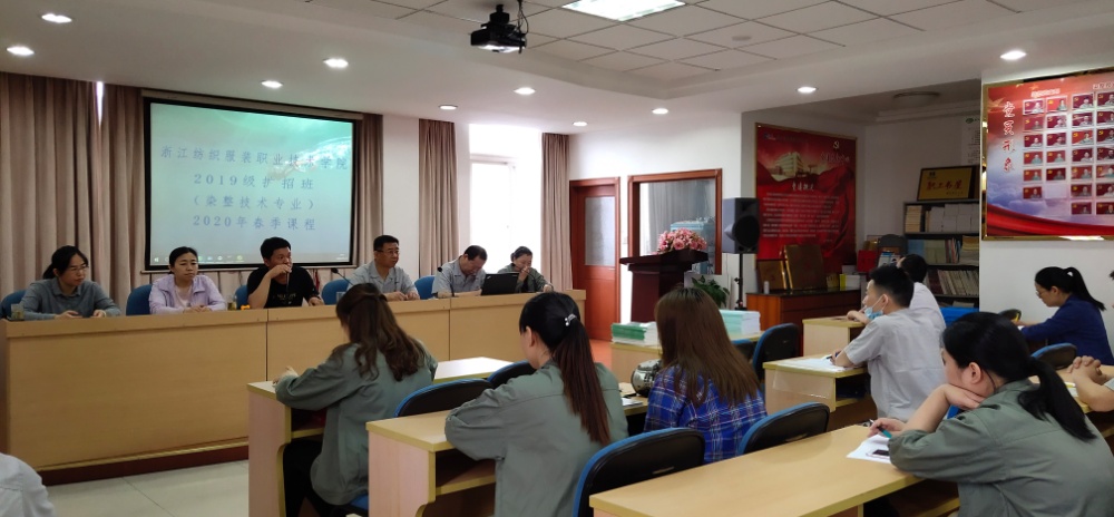 5月30日上午,浙江纺织打扮职业手艺学院2019级扩招班(染整手艺专业)2020年春季课程正式开课了。在课前,公司13名学员在班主任蒋先生的向导下在课前举行了简朴的开课仪式,公司董事长兼总司理莫炳荣、副总莫荣明、总工施道妃工出席了仪式。